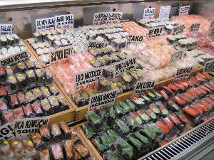 伊勢丹の食料品売り場を覗き見。鮮魚コーナーで衝撃の寿司陳列風景を発見!1個ずつラッピングとは…手が込んでいるというか何というか「エコ」という時代の流れを完全に無視したこのラッピングでは到底美味しそうに見えないと思うんだけどなぁ~。待てよ待てよ、もしかして裸の陳列ではそのままパクッっと食べられてしまうからか?!