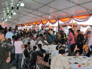 ラマダン(断食)が明けハリラヤのオープンハウスが各地で開催された。首相や市長をはじめ地位がある人、資産家などのお金持ちが主催者となり市民に食事やお年玉(…と言うかどうか分からないがポチ袋に入れたお金です)を振舞うオープンハウスの噂は聞いていたけど、どんな様子なのかちらっと覗いて見る事に。この日はクランという場所で行われたオープンハウスにお邪魔した。写真左のメガネの方が主催者。誰なんだろ~?兎に角規模が半端なく大きい。オレンジ色の服を着たスタッフの数、お洒落した一般人の数共に物凄いっ!身動きが取れなくなりそうだったのでさっと見学のみで帰る。これ正解。帰り道で遭遇したスコールに、折角お洒落して集まった彼らが気の毒に思えて少し憂鬱になった。