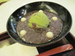ありましたっ!ジャパニーズスイーツカフェ。パビリオン(ショッピングモール)の地下のスーパー向かいに~♪ついこの間まではかき氷が無性に食べたいと思っていたけど、中の冷房でガンガンに冷え切った体にはちとキツイかな…。あったかい抹茶ぜんざいを頼む。子供は抹茶クリームあんみつ。出てきたのはこんな感じ。ぜんざいは「冷たい」ぜんざいでした。アハハ、アイスぜんざいってあったっけ?白玉がすご~く小さいのにもがっかりしたけど、追い討ちをかけるかのように出された「冷たい」ぜんざいにはショックを隠し切れませんでした。でもって温かい日本茶をポットでオーダー。確かお兄ちゃんは「宇治茶」と言ったように私には聞こえたんだけど出てきたのが「ほうじ茶」だったので私の聞き違いだろうなぁ…。まぁそれでもお味は合格点。あんこも抹茶アイスもほうじ茶も日本で食べたあの懐かしい味だったので満足です!マレー人にしては店員の態度も良かったしテーブルもきちんとアルコール消毒してるところは流石。日本人相手の商売だけあって気を使ってるなぁ~と関心しました。
