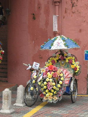 マラッカといえばトライショー。人力三輪車です。観光のスタート地点となるオランダ広場にはコテコテに飾り付けた派手なトライショーがずら~っと並び、観光客相手に客引きをしてます。でも私的には右側の黄色い傘のシンプルなちょっと古びたトライショーに魅力を感じちゃったりするのよね~。猫を抱いてまったりしてるおじいちゃんに近づいてみるがこちらをちらっと見ても動く気配なし。商売っ気全くありません。乗せてもらおうと思ったのになぁ…。「おじいちゃんに大人2人はキツイだろう。乗るのは可愛そうだ」と夫に言われ、後ろ髪を惹かれる思いで諦めました。あ~残念!
