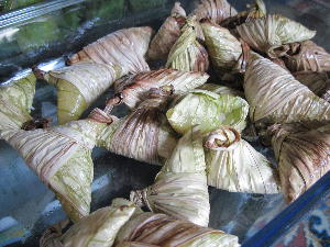 クランタン州の伝統的なハリラヤ料理。左から「クトゥパッ(Ketupat palas)」「ルッマン(Leman)」「タパイ(Tapai)」。クトゥパッは甘い粽みたいなもの。もち米をココナッツミルクと砂糖で味付けして葉っぱに入れて蒸して(茹でてかな?)炒めた甘いお菓子です。これと~っても美味!そしてルッマンはバナナの葉っぱで包んだもち米を竹筒に仕込んで焚き火でじっくりこんがり焼いたもの。これは竹を割って中身を輪切りにカットしてチキンカレーに付けながら食べる主食。これまたカレーとベストマッチ!いくらでもいけちゃいます。最後はタパイ。これはバナナの葉っぱに米を入れて発酵させたもの。マレーシアでは「お菓子」という位置付けのようですがん~…これをお菓子と言ってよいものか?発酵させてあるので実際は甘酒みたいな味がします。美味しいけど食べ過ぎると暑くなって酔うらしいので、子供にはちょっとキツイかも。まぁでも何でこんな貴重な正月料理とも言うべきハリラヤFoodにありつけたのかと言いますと…実はハリラヤ休暇中、我が家はプルフンティアン島でダイビングをしておりましてその帰りに立ち寄ったコタバルでたまたま出会った(…というか助けてくれた)タクシーのおじちゃんが自宅に招いてくれてお昼をご馳走になったというわけ。コタバルに着いた日は丁度ハリラヤプアサ。日本でいう大晦日みたいな日。そしてラマダン最終日でもありました。マーケットも5:00pmで閉店すると聞き、取りあえず目的のバティックを買いにマーケットに走り残り30分で何とかゲット。(この日の夜は唯一営業していたホテル前の中華レストランで辛うじて夕食にありつけたけど…。)次の日はゆっくり博物館やバティック工房を見学する予定。でも何処も閉まってる~!マックすら開いてない。本当に人が一人も居ない。すれ違うバックパッカー達も苦笑い。ホテルも朝のうちにチェックアウト済。あぁ失敗したなぁ~、下調べが甘かった…とトボトボ歩いていたらタクシーのおじちゃんが声をかけてくれまして。結局タイ国境近くの「トゥンパッ」という街にある仏教寺院を色々案内してくれたんですよね~。このおじちゃん、とっても可愛くて良い人!ムスリムなので最初はマレー帽を被っていたのに仏教寺が近付くとおもむろにキャップを交換。この車に一体幾つ帽子が隠されているのか?!何だかんだニコニコ顔でまぁいいから、なんて少し恥ずかしそうにしながら案内してくれました。そしてお昼も近付き恐らく開店しているであろうレストランに案内してくれる事数件。しかし何処も開いてない…。困り顔の我々を哀れに思ったのか「私の家にくるかい?」と申し出てくれまして…急だし奥様も困るだろうと最初は遠慮してたんだけど家に電話して妻の了解も取ったから是非にと言われ、迷惑を承知で伺った次第。おかげで大変貴重な体験をする事が出来ました。何も持ち合わせが無かったので奥様にたまたま鞄に入れていた桜柄の扇子を差し上げました。帰りにはクトゥパッとタパイのお土産を持たせてくれた上、子供達にお年玉まで頂いてしまって。ありがとうおじちゃん!良いお年を~テリマカシ!!