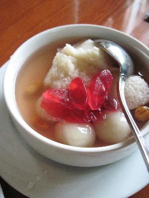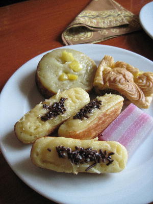 ジョグジャの伝統菓子数種を食してみる。いずれも素朴なおやつである。細長いワッフルのようなホットケーキのような焼き菓子は◎東南アジアでは定番ともいえるヤムイモや焼きバナナ、ういろうのようなスイーツも試してみるがいずれも飲み物が無いと飲み込めない。飲み物なしで焼き芋って食べられないでしょ?そんな感じ。ヤムイモに何で食パンなんだ?!しかも赤いジェリー&はちみつと生姜の効いたシロップ(…というかスープ?)にドボン?温かくも無く冷たくも無い実に不思議なスイーツも取り合えず試してみる。うーん、これはどうかなぁ。シンプルだけどこのシロップを単にお湯で溶かして飲む方がいけると思うのは私だけだろうか…。