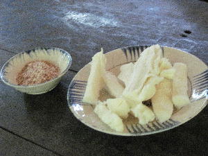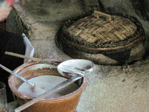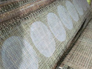 戦線での食事を試食。タロイモを蒸して炒ったピーナッツ+砂糖+塩を混ぜた物につけて食べる。タロイモを食べるのは初めてだったがサツマイモとジャガイモを足したような食感で非常に食べ易い。とはいえ喉が渇くので笹の葉を煎じたお茶を飲みながらの試食。ここでは戦線食の試食の他に、古いタイヤでサンダルを作ったり米を挽いた粉を水で溶いて一枚ずつ春巻きの皮を焼いたりという実際の工程も見学する事が出来る。竹を利用して作った手洗い場やサンダルなどの日用品、不発弾を解体して手榴弾を量産するなどアメリカ軍が落としていった物を有効活用するベトナム人の手先の起用さを垣間見る貴重な体験となった。