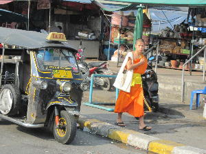 タイの街では朝からお坊さん達が托鉢して回る場面に出くわす事も多い。中には子供のお坊さんも。タイではどうやら立派な成人男子として認められる条件として「出家」の経験があるというのが重要らしい。厳しい修行と禁欲生活を送る本来の僧侶になる方も勿論いるが、一般的には期間限定で2年とか3年とか(兵役みたい…)出家して寺で様々な学問や修行を行うのだそう。花嫁修業ならぬ人間修行といったところか。そんな彼らに渡す「托鉢セット」が市場に売ってました!これ凄く合理的ね~スプーンまで付いてる…。そうそうお坊さんが持ってる通称「お坊さんバッグ」これ可愛いなぁ~欲しいなぁ~と思って市場に行ってみたけど、どれもこれもカラフル過ぎて結局買えなかった。自分で作れなくも無いか…なんてね。