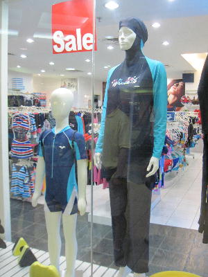 これこれ、この水着!オリンピックで見たのと同じだよ~ん。ビキニを押しのけ堂々のディスプレイ。こんな所で巡り合えるとは…。ステキ♪何だか私この水着が気になるっ!マレーシアで見かける女性は美女が多いと思うのよね~。特にインド系の人はスタイルよくってとっても目鼻立ちが綺麗だから全身隠しても顔だけでいけるんでしょう。羨ましいです…