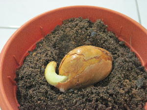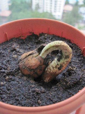 …というわけで猫山王を食した後に「どうにか育てて帰国間際にブンブン村(カンポン)の雑木林かティオマンあたりに記念植樹して帰りたいなぁ」という野望がむくむくと湧き上がって参りまして…現在育てておりますっ!ムフフッ、1つだけ一番大きな種を綺麗に洗いミネラルウォーターを含ませた綿に包んで待つ事3日。見事に発根!3日で発根なんて早っ。さすが「国全体が温室」のマレーシア。土を買って植木鉢に移植。今日で約1ヶ月。根っこはどんどん太くなり今はこんな感じ。そろそろ何か栄養足した方が良いのかな?そもそもドリアンをどうやって育てるかの知識も無いまま見切り発車したこの計画。あんまり過保護に育てちゃいけないし…神様どうかどうか無事に発芽しますように!