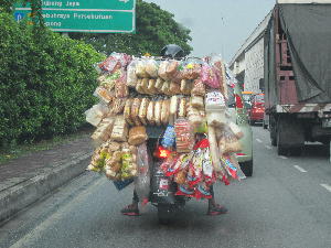 朝の通学風景。小さなバイクに「よくぞ乗せた!」と感心する充実の品揃え。これで高速に乗ってしまうバイクもバイクだが法律上OKなのか~?まぁ、これに限らずもう少し荷物乗せられるバイク(サイドカーが付いたやつ)でジュース売るおじちゃんもパン屋と前後して走ってるけどね…。こちらは傘付き。中々賢い。パン屋のおじちゃんは雨降ったらどうするんだろう?沁みちゃうだろうに…。トロトロ前を走られるとちょっぴりイラッとする事もあるけどきっとこれも懐かしい風景に変わるんだろうなぁ。バランスを取りながら難なく乗りこなすおじちゃんに拍手!