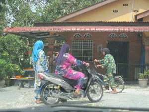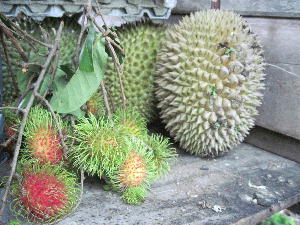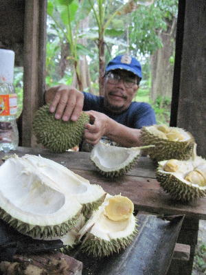 夫の職場のお掃除のおばちゃん。ハリラヤでのオープンハウスに招待された折にも元シェフというだけあり数々の美味しいマレー料理をご馳走になり痛く感動したのは記憶に新しい。彼女がご主人の実家のドリアン畑で明後日ドリアンを収穫するから食べに来ないかと声をかけてくれたので「カンポンガジャ」というドリアンの産地へ急遽お出かけする事に。分かり易く日本の例で言えば「旦那の実家の裏山で竹の子が顔出してきたから皆で採りに来ないか?」というノリ。孫や親戚達が入れ替わり立ちかわり来るとか。おばちゃんの書いてくれたバリバリマレー語の地図を頼りに迷い迷って3時間。途中色々な人に道を聞くんだけど皆微妙に言う事が違うし…。でもマレー人は皆親切。飽きっぽいけど「最初は(だけ?)」皆であれこれ教えてくれました。