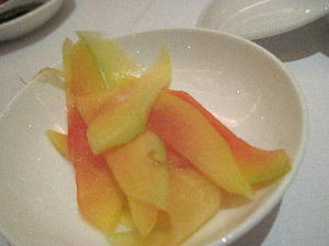 ここ暫く送別ランチ会が続いている。「最後に何食べたい?」「折角だからお洒落して行こう!」「気になるお店がここなのよね…」とお友達が次々思い出作りに誘ってくれる。有難いことである。そうそう、2日連チャンで北京ダックの飲茶ランチを食べた事も。いずれも名だたるホテルの高級飲茶。勿論味は間違いない。そのうちの一つ、この店の箸安めに出されたのがマンゴーピクルス。これお変わりするほど本当に美味しかった。甘からず酸っぱ過ぎず適度な歯応えも残ってるし。持って帰りたいくらいよ~!お土産作ればいいのになぁ…売れるよ絶対!