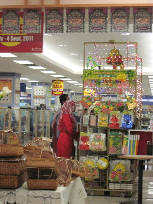 ハリラヤ本番を控えたラマダン(断食)期間中のスーパーは実に楽しい。様々な電飾やデコレーション用品、カード&ぽち袋売り場も充実でオープンハウス用の派手なプラスチック食器やお菓子を見ているだけでも気分が上がる。毎日夕方4:00pmから開かれるラマダンバザールもこの時期だけの風物詩。主に食品なのだが、広~い駐車場いっぱいに店が幾つも立ち並ぶ光景は圧巻。そして7:30pmになると客も店員もいっせいにその場で食事を始めるムスリム達。頭が下がります。