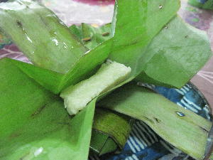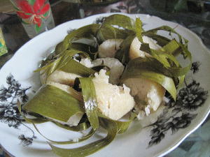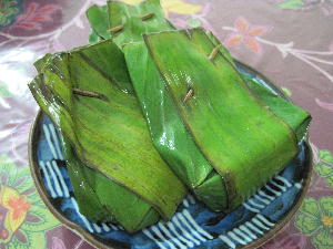 クランタン州の伝統的なハリラヤ料理。左から「クトゥパッ(Ketupat palas)」「ルッマン(Leman)」「タパイ(Tapai)」。クトゥパッは甘い粽みたいなもの。もち米をココナッツミルクと砂糖で味付けして葉っぱに入れて蒸して(茹でてかな?)炒めた甘いお菓子です。これと~っても美味!そしてルッマンはバナナの葉っぱで包んだもち米を竹筒に仕込んで焚き火でじっくりこんがり焼いたもの。これは竹を割って中身を輪切りにカットしてチキンカレーに付けながら食べる主食。これまたカレーとベストマッチ!いくらでもいけちゃいます。最後はタパイ。これはバナナの葉っぱに米を入れて発酵させたもの。マレーシアでは「お菓子」という位置付けのようですがん~…これをお菓子と言ってよいものか?発酵させてあるので実際は甘酒みたいな味がします。美味しいけど食べ過ぎると暑くなって酔うらしいので、子供にはちょっとキツイかも。まぁでも何でこんな貴重な正月料理とも言うべきハリラヤFoodにありつけたのかと言いますと…実はハリラヤ休暇中、我が家はプルフンティアン島でダイビングをしておりましてその帰りに立ち寄ったコタバルでたまたま出会った(…というか助けてくれた)タクシーのおじちゃんが自宅に招いてくれてお昼をご馳走になったというわけ。コタバルに着いた日は丁度ハリラヤプアサ。日本でいう大晦日みたいな日。そしてラマダン最終日でもありました。マーケットも5:00pmで閉店すると聞き、取りあえず目的のバティックを買いにマーケットに走り残り30分で何とかゲット。(この日の夜は唯一営業していたホテル前の中華レストランで辛うじて夕食にありつけたけど…。)次の日はゆっくり博物館やバティック工房を見学する予定。でも何処も閉まってる~!マックすら開いてない。本当に人が一人も居ない。すれ違うバックパッカー達も苦笑い。ホテルも朝のうちにチェックアウト済。あぁ失敗したなぁ~、下調べが甘かった…とトボトボ歩いていたらタクシーのおじちゃんが声をかけてくれまして。結局タイ国境近くの「トゥンパッ」という街にある仏教寺院を色々案内してくれたんですよね~。このおじちゃん、とっても可愛くて良い人!ムスリムなので最初はマレー帽を被っていたのに仏教寺が近付くとおもむろにキャップを交換。この車に一体幾つ帽子が隠されているのか?!何だかんだニコニコ顔でまぁいいから、なんて少し恥ずかしそうにしながら案内してくれました。そしてお昼も近付き恐らく開店しているであろうレストランに案内してくれる事数件。しかし何処も開いてない…。困り顔の我々を哀れに思ったのか「私の家にくるかい?」と申し出てくれまして…急だし奥様も困るだろうと最初は遠慮してたんだけど家に電話して妻の了解も取ったから是非にと言われ、迷惑を承知で伺った次第。おかげで大変貴重な体験をする事が出来ました。何も持ち合わせが無かったので奥様にたまたま鞄に入れていた桜柄の扇子を差し上げました。帰りにはクトゥパッとタパイのお土産を持たせてくれた上、子供達にお年玉まで頂いてしまって。ありがとうおじちゃん!良いお年を~テリマカシ!!