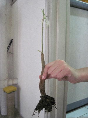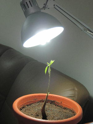 ここ1週間で順調にそしてだいぶ「木」っぽくなってきた我が家のドリちゃん。大きな鉢植えに移植してから、ドリちゃんの成長には目を見張るものがございまして日々お世話しながら驚きと発見の連続で~す!最初はメタリックな輝きを放つ葉の美しさやさやえんどうの様なぺちゃんこの葉にも「へ~、ふ~ん」と驚いたものですが最近この本葉の先が膨らんで開きつつある事に気付いた時はもう本当にびっくり興奮致しました!ベランダも無くあまり日当たりも良くない部屋なので曇りの日にはこんな感じにライト当てて光合成を促したり、日の当たる廊下に出してみたりとドリちゃんの本葉が早く開く所が見たくて試行錯誤の毎日。本当はプールサイドの植え込みが一番日当たり良くて良さそうなんだけどなぁ…重くてそこまで運べないし~こうなってくると可愛いくて愛しさ倍増。枯らさないよう頑張って育てなきゃね♪