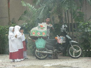マレーシアの学校では皆大体こんな感じの制服を着て通学してます。基本女子は白いトゥドンで男子は黒いマレー帽。リュック&スニーカーというのが定番スタイル。(インド系でムスリムじゃない女子の中にはたまにベール無しでブルーのジャンパースカートという人もいる)小学生は赤、中高生はブルーと色も決められている。通学路のモスクの前で店を広げるサテー屋さんに子供達が群がる。「買い食い」するのは何処の国の子供も一緒ね~♪アイスではなくサテー(焼き鳥)という所が渋いねぇ~!実にマレーっぽい。