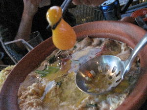 夕食にカンボジアの名物「チュナン・ダイ」(鍋)を食べてみる。牛肉をメインに野菜・キノコ・湯葉?なんかが入った栄養たっぷりスープが体に沁みる。〆は卵を落として麺を入れる。…がこの麺、量が半端なく多い。鍋が来る前、既に揚げ春巻きやら魚のココナッツカレーやら麻婆豆腐?に牛モツスープなんか食べちゃった後だっただけに麺は不要。ご飯だったらおじやにしていけたかも。私的には鍋のスープで充分だったんだけど…。麺は半分の量でOKだったなぁ。残してゴメン!勿体無い事しちゃった…。