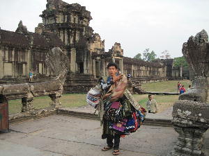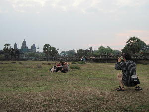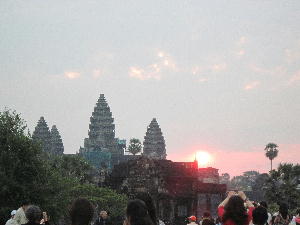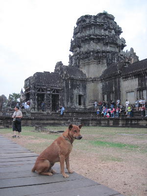 年に2日春分の日と秋分の日に西参道から正面の中央堂に昇る朝日が見られるアンコールワット。この日は丁度春分の日。絶景の朝日を見ようと、世界各地から物凄い数の観光客が訪れている。アンコールワットに入る為には入り口で顔写真入りの1日券か3日券などを作成&購入し、各ポイント毎に一人ずつチェックを受けるというシステム。(このチケット忘れたり無くしたら中には入れません。)トゥクトゥクや自転車、観光バスや小型バンで乗り付けた観光客がひしめくチケット売り場。ワットに着き遺跡に座って朝日を待つ間にも可愛い野良犬(首輪してるから飼い犬かな?)や布を手に売り歩く土産物屋さん、目の前でモデル張りに様々なポージングで記念写真を撮り続ける中国人なんかを見ていられたので全然飽きずにすみました。それにしても中国人はやっぱりマナーが悪い。。後から来て平気で人の視界遮るんだもんねぇ。無理やり割り込んで座るし。遺跡に平気でゴミ捨てるし。(何で中国人はとうもろこしが好きなんだろう?食べながら遺跡は歩いちゃいかんよっ!)