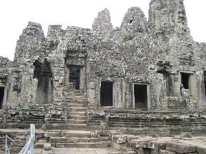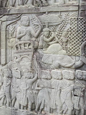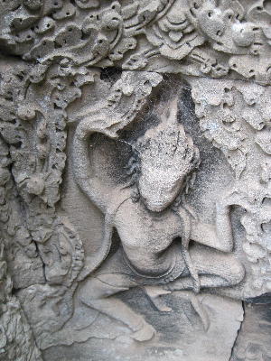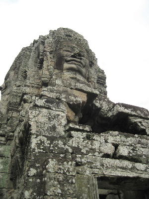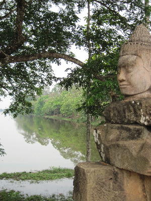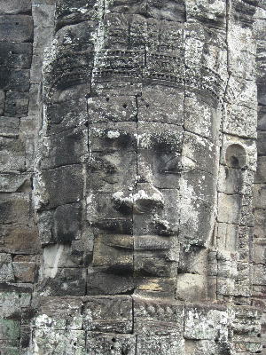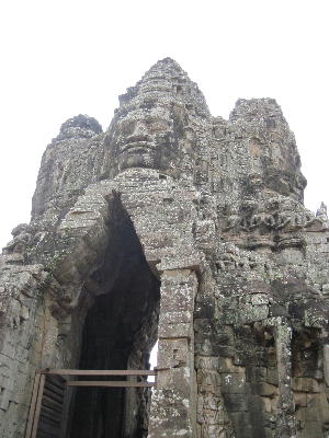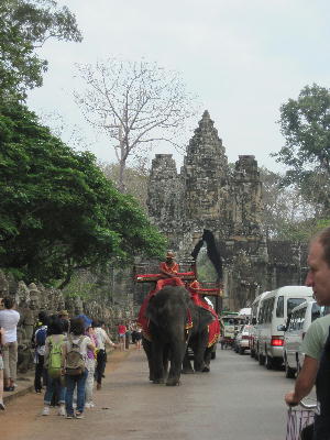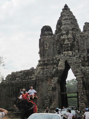 アンコールワットからバイヨンへと続く道上に建つ南大門。道の両側には神々と阿修羅がナーガ(ヘビ)の胴体を引き合う像が立ち並ぶ。修復された像も幾つかあるけど、やっぱり風化されて崩れた顔や苔がはびこる像には年月を経た美しさと迫力が感じられます。この道を象の背中に乗ってこんな風に通過する事も。絵になるぅ~!早くも「トゥームレイダー」の世界。ドキドキするなぁ~クロマー巻いて帽子を被り日焼け対策は万全。暑いけどこれから巡る遺跡への期待感MAXですっ!