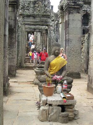 アンコールトムの中央に位置するバイヨン。一部修復中のエリアも。観世音菩薩の四面塔が立ち並ぶバイヨンはそれらの表情からかどことなく柔和な空気が漂っている感じがする。レリーフや彫刻等も状態が良く、当時の暮らしぶりや戦いの様子などがはっきりと分かる。遺跡の中の広場では当時の扮装をした人々と記念写真が撮れたり(有料…というかチップです)バイヨンの中に何箇所かある仏像の前でお線香を奉げてお祈りする事も出来ます。線香代というか気持ち程度の寄付金(我々は遺跡修復&保存に当ててくださいという意味を込めて渡しました)を渡すと仏像を守っているおばあさんが毛糸の赤いミサンガを手首に巻いてくれます。これ、願いが叶うお守りなんだって!今年はダブル受験。しっかり「合格」お願いしちゃいました~。