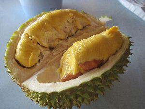 市内から少し離れた所にある果物屋さん。時期的にやっぱり「ドリアン」圧倒的に多かったです。日本の観光地で良く目にする梨や葡萄や桃や林檎なんかを並べて売ってる屋台を大~きく長~くした感じ。品揃えもなかなか。この日は高価で普段中々手が出せないドリアン「猫山王」をえいっ!と1個50RMも出してマレーシア滞在の記念に買って食べてみました。お~っ?!今迄に無い上品な味わい。しかも花のような香りで全然臭み無し!種は小さいから果肉たっぷりでとってもクリーミィー♪やっぱ違うなぁ~。いつもドリアン食べた後はゲップやオナラ(失礼!)が出る事があるんだけど今回はそれも無し。う~ん、最初にこれ食べておれば…。でもこれを食べた後にランク下げるのもキツイと思うと何だか複雑…。でも本当に美味しかった!また是非お目にかかりたい逸品です。