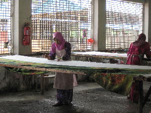 街から少し離れた場所にあるバティック工房。馬小屋の隣。コンクリートの廃墟のような建物の1階で女性達によって美しい布が染め上げられていた。ここはコタバルでも老舗のバティック工房。完全分業制。この様に美しい布は生地問屋に卸しているらしく小売はしていない。ジャンティンも縦に細長く大きめ。ささ~っと実に軽やかな手捌きで色注しも暈しの加減を知り尽くしているのか迷いが無い。熟練の技は見ていてとても勉強になる。帰りはタクシーが無いので工房のおじちゃんがマーケットまで送ってくれたし、このジャンティンが欲しくてマーケット近くのクラフト博物館で尋ね歩いてたらオーナーが自らバイクで買ってきてくれたりと今回の旅ではホント親切なマレー人に沢山助けて頂きました。ありがとね~