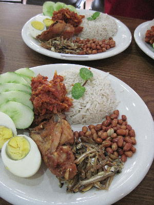 2月のマレー料理教室はマレーシアの代表的な食べ物の一つ「ナシレマ」。ココナッツで炊いたご飯にきゅうり・ゆで卵・揚げたピーナツ・いりこにサンバルという辛いソースを絡めて食べる庶民派グルメ。街の屋台では葉っぱに包んで1つ2RM位で売ってます。これマレー人は日本で言うとおにぎりみたいな感覚で食べてるかな~?私はこの「サンバルソース」の作り方が知りたくて今回参加を決めましたっ!前々からこのソース、ナシレマだけじゃなく色々使い勝手が良さそうな気がしてたんだよなぁ~。(魚やチキンばかりでなくきっと炒め物の隠し味にも…?!)今回の講習はナシレマスペシャルバージョンとでもいう感じでチキンも付いてたしサンバルソースにもエビなんかた~っぷり入ってたので物凄く美味しい!確かに美味しいんだけど…でも結論から言うとナシレマ我が家では作りませ~んっ!食べたい時は2RM出すよ~。だって材料も手間も半端なく多いんだもん。それにやっぱりマレー料理。油が…凄いっ!カロリー高いぜ、これは。英会話の先生にこの話をしたら、「私流で良かったらもっと簡単でヘルシーな作り方教えてあげるわよ」って言ってくれたので今から楽しみにしてまぁ~す♪