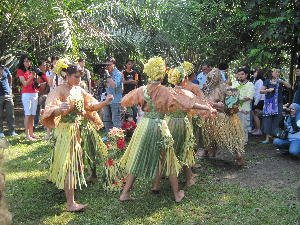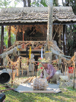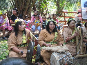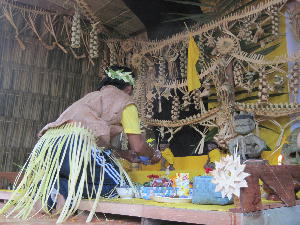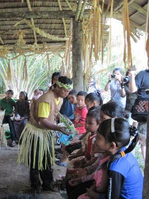 以前紹介したブンブン村で新年の祭りが執り行われると聞いたので見に行ってきました。何でも3月5日はインドネシアの暦で新年という事らしく、元々インドネシアから移住してきた村の先祖に習ってこの日に祈りを奉げるのだそうです。会場はパンダンリーフで作られた様々な飾りでデコレーションされとてもとても美しい!!これを見れただけでも来た甲斐があったというもの。古いパンダンと新しいパンダンの2色を使って祭りの装束や繊細な祭壇飾りなど上手に編み上げて作ってある。花や鳥、冠や髪飾り、ピアスやブレスレットなどのアクセサリーまで…。一体準備にどれ位かかたんだろう?!感動しちゃいました。手作りの温かさ溢れる会場のみならず村人が猿に扮して踊る様子もコミカルで微笑ましい。因みに猿の髪や腰巻の1本1本もパンダンで細かく編み上げられておりました。祭壇に奉げた魔除けの液体(パンダンの香りがするココナッツの白い液体かなぁ…と推察)を先ずは子供達から額と手に振りかけてもらいマカン(振る舞いの食事)が始まる。村人と我々外部の人間が一体になる瞬間。KLのクラフトセンターで大規模に催されているクラフトイベント(マレーシア全土のクラフトが一同に集まる)にもこの村から出展してると聞いたので帰りにでも覗いてみようと思う。