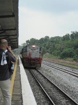 2月に入ってから夫の職場&子供の学校関係で日本へ本帰国する方々の送別会が連日のように執り行われている。その中でもコタバルへの1泊送別旅行はある意味「一生忘れる事が出来ない程の大きなインパクト」を参加者の胸に残して幕を閉じた。車窓からジャングルの景観を眺めるつもりが「車内がジャングル」にっ!シンガポールから出発されるKTMに乗って途中のMentakab駅からWakaf Baru駅まで約7時間の電車旅を「優雅に満喫」する予定だったのだが…。事前の話では食堂車や寝台車もありクーラーも利いてるという事だったのでてっきり日本の新幹線のイメージでいたら後にとんでもない電車だという事に気付かされるハメに。あ~忘れちゃいけない、やっぱりここはマレーシアだった…。こじんまりした駅舎はこんな感じ。電車が来ると駅員がこのベルで到着&出発を知らせる。停車時間の設定は無いので来た電車に走って飛び乗る感じです。一応時刻表はあるんだけどあくまで目安。予定時刻に駅でスタンバイし一体何時来るのか分からない電車を待つ事2時間半。遅れに遅れて到着した電車はそれはそれは酷いGトレイン。絶対燻蒸消毒してないだろっ!掃除もして無いじゃん!あちこちにゴミ放置だからまぁ当然といえば当然なんだけど。こんなに凄い数と種類のGと7時間も一緒かと思うとぞっとしておちおちシートにも座れません。人がホイホイの中に居るような感じ…念の為食堂車にも偵察に行ったけど踏み込めませんでした…。駅で電車を待つ間に近くのコピでチキンライス食べといて本当に良かった~それにしてもマレー人は強いというか動じないというかGと共存というか…Gを見てはキャーキャー騒ぐ日本人を不思議そうな目で見てましたっけ。