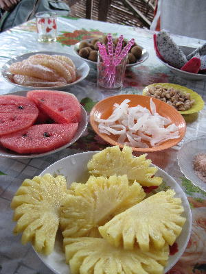 市内のあちこちで見かける露天商。ヘルメットやマスク、巨大な風船に雑貨など日用品の販売からこんな風に寝ちゃってるけど観光客狙いのシクロのおじちゃん、ココナッツジュースや果物なんかもあちこちで売ってます。変り種はこの空き缶細工のお店。おばちゃんたちがブティックの入り口にお店広げてバッグや帽子を製作中。これが果たして実用的な物なのかはさて置き、たま~にジュースやお菓子なんかも摘みながら実に楽しそうなおばちゃん達。誰かの家のリビング風、な感じを醸してました。ベトナムはスイーツばかりか果物の種類もと~っても多くてしかも美味しい国!特にみかんは小粒ながら甘くてとっても美味しかったです。今回初めて食べた果物(ジュースですが…)は「カスタードアップル」と「チェリー」(…とおばちゃんは言ってたが多分違うと思う。)カスタードアップルはちょっぴりしつこいけどヨーグルトシェイクみたいな味。チェリーは種がいっぱいで姫林檎みたいな甘すっぱさがたまりません~。グレープフルーツと夏みかんを足したような「ザボン」も手が止まらないっ!日本を発って以来、みかんを見るのは実は初めて。(マレーシアには無いのです…)みかん大好き人間のアンテナはまだまだ錆びちゃぁ~おりませんよ!遠くからでも匂いは嗅ぎ分けられますのよ~オホホ♪