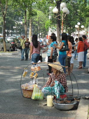 バイン・ケップの屋台。ワッフル模様の型で焼く薄いクッキーと一口サイズのホットケーキ。この2種類をおばちゃん1人で実演販売。郵便局の前の路上がと~っても甘くて良い香りに包まれて…思わず誘われて買い食いしちゃいました♪焼きたてのクッキーは路上とは思えない程の美味しさで一度食べ出したらもう手が止まりませ~ん!それにしても喉は渇くものでして…お~っと心配ご無用。ちゃんと隣にはココナッツジュース屋さんが控えております。見事な連携、これも生活の知恵なり?
