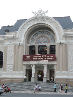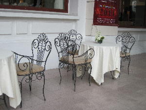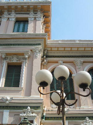 市民劇場とその近くにあるホテルのオープンカフェ。バロック様式の劇場正面に施された天使やその他の彫刻がやけに綺麗に残ってるなぁ、と関心して見ていたらこの建物は2000年に復元された物らしくどうりで…という感じ。(屋根も最近塗り替えたのかな?ガイドブックでは赤かったんだけど…。)劇場近くにあるコロニアルスタイルの老舗ホテルの通りに面したオープンカフェも(特に椅子ですが)実に美しく、ウェイターの制服も「インドシナ」を彷彿とさせるものでとても絵になるぅ~。またまたプチパリ発見!
