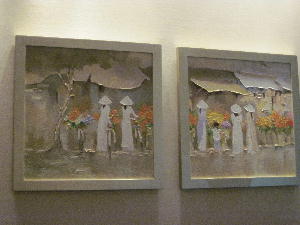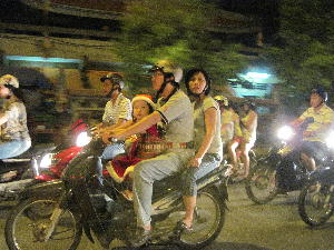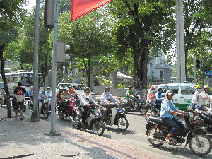 ベトナムへ来て一番驚いたのはバイクの数とその運転。とてもマレーシアの比ではない。ベトナムの方が「数倍怖い」のでありますっ!バイクレーンが無い為、車もバイクも自転車もごちゃごちゃっと入り乱れてこんな感じ。歩道にも平気で乗り上げちゃいます。ギリギリスレスレでの追い越しやヘルメット無しで3~4人乗りは当たり前。タクシー乗ってもぶつかりそうで終始ドキドキしてました。怖くてとてもこの地で運転なんて出来ませ~ん。あ~マレーシアで良かった…。信号が無いベトナムでは当たり前の事なのか「歩行者優先」という考え方は皆無。(この辺はマレーシアと同じ)歩道に足を踏み出せばバイクや車が減速して横断させてくれるだろうという甘い考えは通用しないのであります。「彼らは決して止まらない」という事を常に頭に入れて行動しないといつまで経っても道を横断する事が出来ないばかりか、下手すると轢かれて大怪我する事にもなりかねません。(現に足や腕や頭に包帯巻いた欧米人観光客を何人か見かけました…)まぁ道を覆いつくすバイクの波に向かって足を踏み出すのは相当な勇気と覚悟がいるもんですが、横断のコツは…歩き始めたら「そのままの速度を保って」ゆっくり歩く、これしかないっ!と経験で分かりました。バイクが迫って来たからといって急に走り出してはいけません。止まってもいけません。怖くても囲まれても「そのままの速度で」ゆっくり歩けばバイクが避けて走り去ってくれるのです。ついでに手を上げて「不慣れな旅行者、渡りまぁ~す!」とアピールすれば優しいベトナム人はちゃぁ~んと避けて通してくれます♪旅の思い出№1は「道を渡れた自分」でしょう…やっぱり。