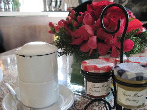 ホテルの朝食で頂いたベトナムコーヒー。こんな素敵な磁器のフィルターがあったなんて…知りませんでした。これ欲しいっ!(こんなに長~く生きてきたのにアルミ製のしか見た事無かったもんで…)という訳で探しましたよ♪食器専門店Qホームで見つけちゃいました!「ミンロン」社製でこれ1セット(フィルターセット+カップ&ソーサー)日本円で500円位。私が購入したのはこれと同じタイプでフィルター・皿・カップの縁にゴールドのラインが入った物。それでも1セット700円しない感じだったかな?と~っても可愛いのにリーズナブル!(まぁ、市場でアルミ製のは50円とか100円位で売ってるからそれに比べるとお高い方なのかもしれませんが…)お土産に一押しです。Qホームには勿論目が眩むほど高価でゴージャスなティーセットやディナーセットも目白押し。見ているだけで幸せな気分にさせてくれます。