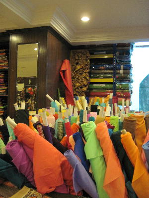 クランのインド人街にある生地屋さん。テイラーも勿論併設。ここのスタッフは全てインドから派遣された腕の良い職人達だそう。完全分業でサリーはサリー専門、裏地は裏地専門、パンツはパンツ生地専門、糸は糸専門の職人というふうに各セクションでプロフェッショナルのアドバイスを受けながらオーダーメイドする仕組み。パンジャビなどの既製品やアクセサリー等も販売している。基本タミール語しか通じないのだが1人だけ英語が話せるスタッフが居てこの人に出会えれば通訳してもらえる。せっかくこの店の常連である英会話の先生が連れて来て下さったので私もパンジャビスーツを作る事に。表地、裏地、パンツ生地、糸、そして最後にテイラーという順に回って行く。生地の種類も実に豊富。仕上がりが楽しみだ。