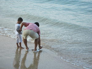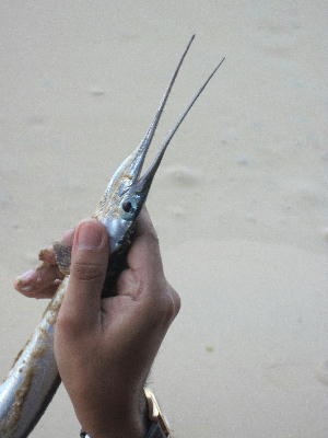 ティオマン最終日の朝。海を見ながらレストランで朝食を摂る。いつものフルーツ(スイカとメロン)と紅茶、それと今回は持ち込んだカップスープとパンを食べながらこの風景も暫く見れないなぁ、なんて感傷に浸っていると尻尾を立てながらとっとこ水面を横切って行く長い魚が2匹。ピカピカ光ってあっという間に視界から消えたと思ったら砂浜に打ち上げられてもがいていた。レストランにいたマレー人の親子が猛ダッシュで走って行く。食べるのかな?それとも海に戻してあげるのかな?と紅茶をすすりながら思いを巡らすと、戻ってきた親子を囲みいきなり始まるレストランでの撮影会。私も横からパチッと便乗。この時点ではまだ息があった魚。名前は分からないけどピカピカ光って美味しそうだったなぁ。撮影会が終わって魚を海に返す親子。動け動けと突っついてるけど流石にもう無理だよ、陸に長く居すぎて息が無いもん。こりゃ他の魚の餌だな。