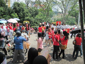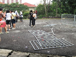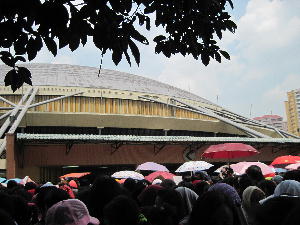 JYJ(東方神起の辞めた3人)の新曲アルバムお披露目のショーケースライブチケットを夫の知人から譲り受けたのであまり乗り気じゃなかったんだけど取りあえず行って見る。チケットはアリーナでフリースタンディングというエリア。簡単に言うと椅子は無く、決まった席が無いのでライブ中そのエリアなら自由に移動しながらデジカメで写真も撮れるファンには嬉しい席らしい。(マレーにも熱烈なファンがいるんだ…。)情報が回っているらしく、この日は赤の服で参加している人が殆ど。個人的な関心事はマレーのファンはこんな時でもあのベールを被るのか?一体どんな勝負服を着てくるのか?という2点のみ。やっぱりベールは被ってたなぁ。勝負服は…特に無いようでしてジーンズに長袖Tシャツ。サンダルだけは入り口で普通のビーサンから踵の高いポックリサンダルに履き替えてたくらいです。会場時間が過ぎても入り口が狭いため中々列が動かず、挙句にスコールが降ってきたもんだから押しくらまんじゅうで足は浮き上がるわ雨で全身びしょびしょになるわで「圧死」という2文字が頭をよぎるくらい怖い目にあいました。柵はご覧のようになぎ倒され無残なまま放置。ライブ前がこんな状態なので疲れがピークに達しとても楽しめる感じじゃなかったのが残念。まぁそれでも長身で適度に鍛えられた体と美しいダンスを見る事が出来たのでよしとしなければ!?久々に目の保養~