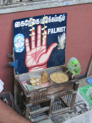 インド人街へ行った時、道端で「カナリヤ占い」をするおじいちゃんを何人か見かけました。手相と生年月日を伝えるとおじいちゃんがカナリヤに声をかけ、カナリヤが何枚もあるカードのうちの一枚をくちばしで引き当ててその番号札の中に書かれている文章をおじいちゃんが読んでくれるといういわゆる「おみくじ」。こう言っちゃなんだけどカナリヤに芸を仕込むのは結構簡単なんじゃないの~?とかどうせ上から順に札をコツコツ指示すだけじゃないの~?とか疑問符いっぱいの私は勿論素通り。でも子供がどうしてもやってみたい!と言うので仕方なく後戻り。5RMだしまぁいいか、とお付き合いする事になりまして…。雨が降る中カナリヤの動きに全員の視線が集中。驚く事にカナリヤはカードの上を行ったり来たり。たまに立ち止まりながらも重なったカードを一枚ずつくちばしで銜えては除け銜えては除けを繰り返し、何と上から3枚目のカードを選び出したのであります!へ~カナリヤやるじゃん!案の定悪い事は何も言われなかったうちの子供。すっかりカナリヤの賢さ?に魅了されたようです。言われた事はペナンの寝釈迦仏寺院で引いたおみくじとほぼ同じ。これまた不思議。ちょっぴり心が揺れました…。