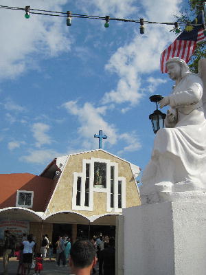 ポートクランは小さな港町。ここにあるセント・アン教会に行ってみました。英会話の先生が誘ってくださったのです。(先生のお母様にも紹介して頂きました。)丁度この日は1年に1度3週間にわたって開かれるお祭り(特別なイベント)の真っ最中。このカトリック教会に集まるのは殆どがインド系。中華系も見かけましたが…。皆さんとっても美しく着飾っていて、色鮮やかなサリー&アクセサリーの素敵な装いを見ているだけでも凄く楽しかったです。様々な食べ物やグッズなどを販売する屋台も道の前いっぱいに広がっていて、沢山の人で賑わっていました。この日のミサはゴスペルミサ。厳粛なムードというよりは寸劇も交えてのとても陽気でテンポ良い明るい感じ。神父様の巧みな話術に関心しきりでございました。ランチは夫が釣りをした帰りに寄ったという蟹島(クラブ・アイランド)でシーフードを食べるという事でしたのでフェリーに乗って行ってきました。