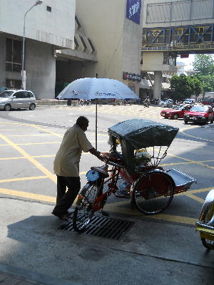 ジョージタウン散策に市内を走る路線バスを使ってみよう!と停留所でバスを待つがいつまで経っても全然来ない…。このままでは1日終わっちゃう~!干からびちゃう~!と諦めてタクシーを拾おうと動き出したらす~っとどこからともなくトライショーが2台近寄ってきた。市内観光の勧誘。マラッカではおじいちゃんに運転させるのは気の毒だからと結局乗れなかったが、今この状況でそんな事は言ってられない。子供達も乗りたがってるし…まぁいっか、ということでお願いする事に。マラッカとは対照的に運転手の年齢層が高い!おじいちゃん世代。でもシンプルなトライショーは私好み。普通にこんな感じで「車道」を走ります。それもかなりゆっくりと。でも心得てるのかトライショーには道を譲るしクラクション鳴らさないし運転手は皆優しいのであります。「特別扱い」なのですが、渋滞ともなると私達は良い見世物になるのでちょっぴり恥ずかしい…。写真撮られたり…。でもここはリゾート!何でもアリなので許しちゃうのであります。