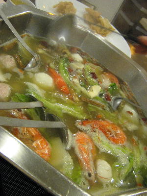 スティームボートを初体験。まぁ、いわゆる「海鮮鍋」なんだけどこのスープがと~っても美味しいのです!そして何より体に良い。辛いのと辛くないのとどちらかを選んでも良いしハーフ&ハーフにすると中に仕切りを入れて二種類のスープを楽しむ事も出来ます。今回は辛くない「ハーブスープ」(店のメニューにはこう書いてあります)をオーダー。薄味だけどしっかり鳥の出汁もきいていていくらでも飲めちゃいます。中にはナツメ・クコの実・牛蒡・長芋など数種類の漢方が入っていました。具は好きな物を単品で追加注文していくスタイル。八角形のたらいみたいな大鍋にた~っぷりスープが入って運ばれて来ます。基本の付けダレもあるにはあるけど自分でアレンジを楽しむのもありですよ。鍋は大人数でワイワイ!がやっぱり楽しい♪そうそう日本で鍋の野菜は白菜&豆腐が主流。でもこちらではレタス&油揚げなのでした。
