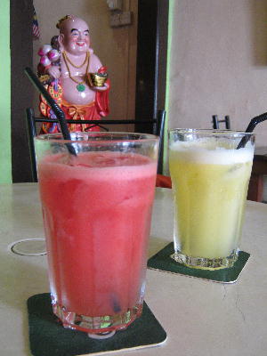 スイカジュースとパイナップルジュースをカフェでオーダー。シロップ無しの冷えたフレッシュジュースを出してくれる所は本当に貴重です。大抵の所は何も言わないとシロップ入りか、たまにフレッシュジュースがあっても冷えてるどころか物凄く温かったり…。下手するとジューサー自体を毎回洗っていないようでアップルジュースを頼んだつもりが前の人が頼んだであろうキャロットジュースの絞りかすと混ざってアップルキャロットジュースが出てきたりする事も実際あるのです。あ~デパ地下のジューススタンドが懐かしい~っ!果物の甘さそのままで久し振りにとっても美味しい!と実感出来るジュースを頂き生き返りました。これで一杯4,5RMは安い!勿論一気飲みです。