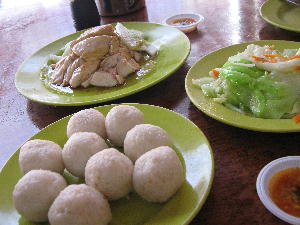 ボール状のチキンライスはマラッカの名物。このライスをスプーンで半分に割りチキンスープをブレンドした特性のタレをつけて頂くのがマラッカ流とか。蒸した鳥もジューシーで柔らかくいくらでもいけちゃいます。野菜にも鳥にも合う特性「タレ」の威力恐るべしっ!以前KL市内で食べたチキンライス屋さんではご飯をお椀に詰めてお皿にひっくり返した形態で出てきました。これはこれでふわっとしてて美味しかったのですが、このぎゅうぎゅう握ったボールももちっとしてまた違った味わいがありました。サテーをはじめマレーシアで鳥メニューは数あれど、鳥ちゃん好きに一押しお勧めの逸品でございます♪