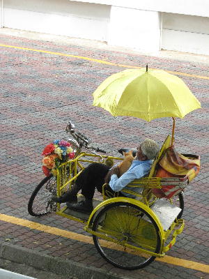マラッカといえばトライショー。人力三輪車です。観光のスタート地点となるオランダ広場にはコテコテに飾り付けた派手なトライショーがずら~っと並び、観光客相手に客引きをしてます。でも私的には右側の黄色い傘のシンプルなちょっと古びたトライショーに魅力を感じちゃったりするのよね~。猫を抱いてまったりしてるおじいちゃんに近づいてみるがこちらをちらっと見ても動く気配なし。商売っ気全くありません。乗せてもらおうと思ったのになぁ…。「おじいちゃんに大人2人はキツイだろう。乗るのは可愛そうだ」と夫に言われ、後ろ髪を惹かれる思いで諦めました。あ~残念!