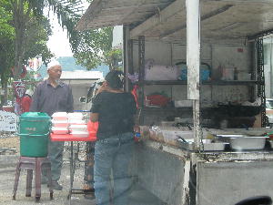 ショッピングセンターの前ではお昼時になるとこんな風にテイクアウト専門の弁当屋さんが屋台を広げる。弁当だけではなくカットフルーツ専門の屋台、ジュース専門の屋台、豆腐専門の屋台、カレー専門の屋台など種類も豊富。この屋台は多分経済飯(ナシ チャンポー)の屋台だと思う。数種類のおかずを選んでご飯の上に乗せるぶっかけ飯タイプらしいので。この前初めて経済飯を食べた時、色々なおかずを少しづつ取って乗せたら18RMと凄く高くついて驚いたのを思い出しました。後で知り合いに聞いてみると、経済飯は量ではなく種類でお金が加算されるシステムらしく、従っておかずの種類を1つか2つに絞るととっても安く済ませられるという事実が判明。次はこの教訓を生かすぞっ!