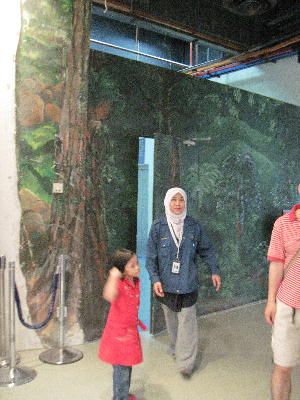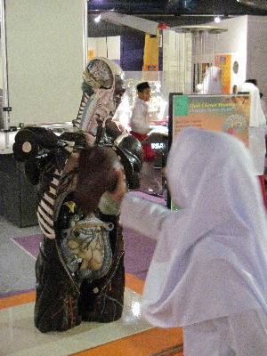 国立科学博物館(通称メロンドーム)の3階に図書室があると聞き、探していた鳥や植物の本が無いかと思って行ってみました。でも上に上がるエレベーターが無い…。2階までは通路があるので歩いて行けるんだけどその先が無いのです。学芸員らしき人に聞くと1階にエレベーターがあるという。ん?今扉の向こうに見えたような…あれか?そう、この文化祭のパネルのような巨大な絵の向こう側にエレベーターホールがあったのです。これじゃ全然分かんないよ~!何とも不思議な気の使い方です。知る人ぞ知るこのエレベーターに乗って3階へ。3階はクーラー無し。ものすご~く暑いのでした。この日は残念ながら閉館後。そうそう、ここに展示されている人体模型は黒い肌の色をしてました。国によって違うのね~