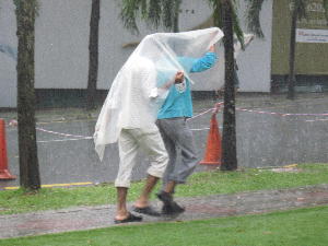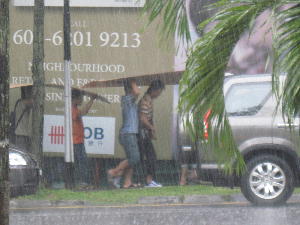 突然のスコール。あと100mという所で雨宿りする事30分。スコールが来るとおさまるまでは身動きが取れないので仕方なくマンウォッチング。すると傘を持たない人達が大きなビニールシートや薄い木の板をこんな風に被って歩く姿を目撃。わぁ~!こんな大きなビールシート、いつも持ち歩いてるのかな?それともその辺にある物を拝借か…?ま、洪水の中無理に歩かずともそのうちからっと晴れるし~。滑って転ぶより雨宿りが正解!です。そうそう、この辺の側溝には網や蓋などついとりませんっ!スコール対策で側溝の深さも1メートル近くと半端無いので落ちないように気をつけなければなりません。大人でも足を滑らせて落ち、骨折したり半月板損傷で手術した方を知っています。子供は特に要注意!死にかねません…恐ろしや~