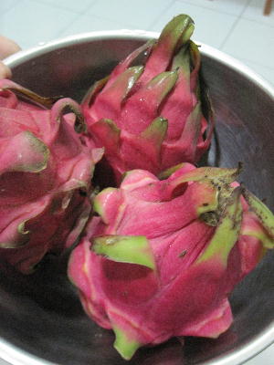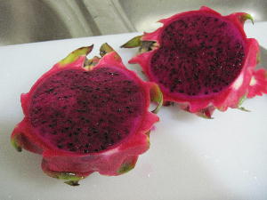 初めてドラゴンフルーツを食べたのはマレーシアに来て泊まったホテルのビュッフェで。食べると舌が赤紫に染まる。その毒々しい色にはじめはちょっと抵抗感もあったのだが、食べてみると食感も見た目も甘みを抑えた赤いキウイそのもの。とっても気に入りました。レモンをかけて食べると甘みが引き立つそうですよ。スイカに塩をかける感じかな。ホテルでは赤いのと白いのと両方あったんだけど、市場では白いドラゴンフルーツにはお目にかかっていない。お~いどこで買えるんだぁ~い!