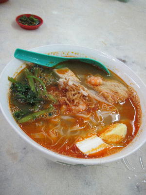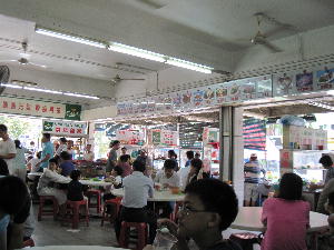 市場の近くの屋台でえびそばを食べてみた。トムヤムクンに近いスープに細麺と平麺の2種類のビーフンが入っている。付け合せのたれがものすご~く辛いのでそれは入れず丁度良い味加減。すごく美味しい!はまる味だな、これは。子供達は肉団子入りの太麺を食べていたんだけど、こちらもなかなか良いお味でした。あっ、それから飲み物は全て「ノーシュガー」が合言葉ですよ!この一言が無いとたとえお茶だろうがものすごく甘いシロップをドボドボ入れられてしまいます。お忘れなく。