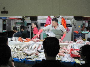 鳥や魚や果物屋さんが沢山あってそれぞれ値段設定もまちまち。なので色々お話しながら値切ったりおまけしてもらったり、それが結構楽しかったりもします♪でも、築地のような掛け声や活気は全然見られませんでした。皆黙々と鳥や魚を捌いていて静かぁ~な市場でした。